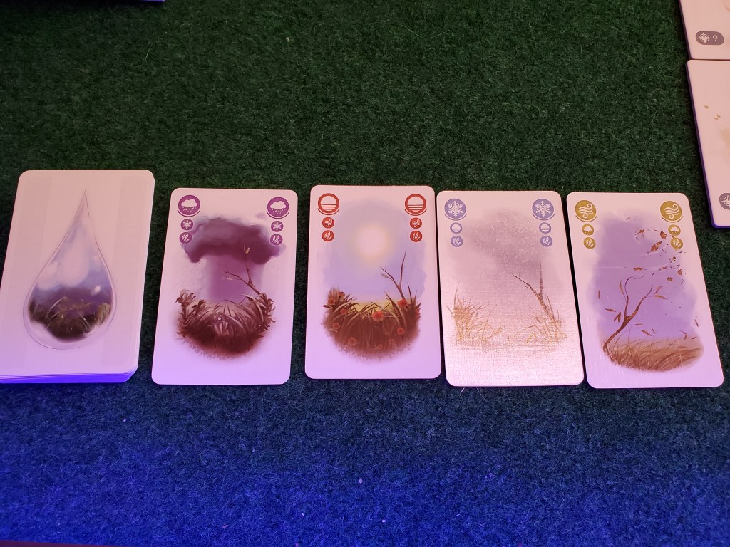 - During set up: number the tiles. We use dry erase tokens to put on the tiles to number them for ease of explaining what tile is affected. You could also use paper that you cut up large enough to write numbers for the other sides to see.1a: During set up: the side without the game may want to write down each tile number and the scoring potential for reference during play. 1b: If all sides have a copy, then the non-random sides organizes their player cards in stacks of each weather type to be able to grab into their hand when shown what their cards are by the random side.