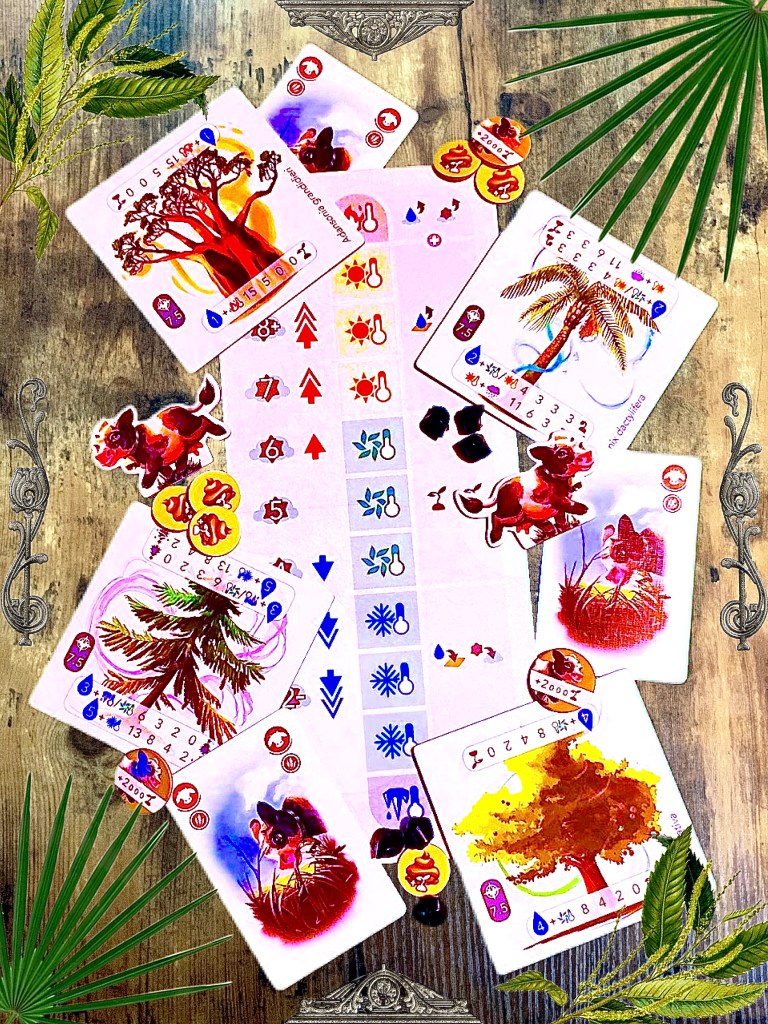 Lizzy: Ah, yes. Being the Methane Princess: heavy is the head that wears the crown. The temperature is dictated by how much methane is currently sitting in the active clouds. The Cows expansion offers new tiles with point values directly correlated to the current temperature, the top-most and bottom-most temperatures being difficult to achieve without forethought and guile. One playthrough in particular was a spectacular grind! We paired the Sweet Chestnut (requiring a Temperate climate) and the Baobab Tree (requiring Scorching climate, the hottest option) together. This was like turning the game setting up to hardcore mode! My takeaway is to pair the hotter or colder options together if you want the perfect strategic addition to the main game, or chuck in opposing temperatures for an all out, brain-busting, tug of war experience.