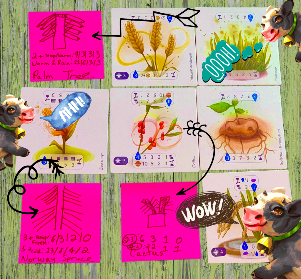 Kitty: In true Petrichor fashion, the Cows expansion has continued the tradition of beautiful, understated artwork, appearing to have been pulled straight from a horticulturist’s sketchbook. This small yet mighty expansion offers four new vegetation tiles, two adorable cows with one-track minds, a climate tracking board, and heaps of methane and manure (a phrase I never knew I’d say with excitement)! The design of the cows and tokens all fit perfectly into the artistic family. Although… they’re clearly not as beautiful as Brooks & my proxy tiles (gracing you below with evidence of my artistry), or as our proxy cows (unicorn/dragon, ftw)!