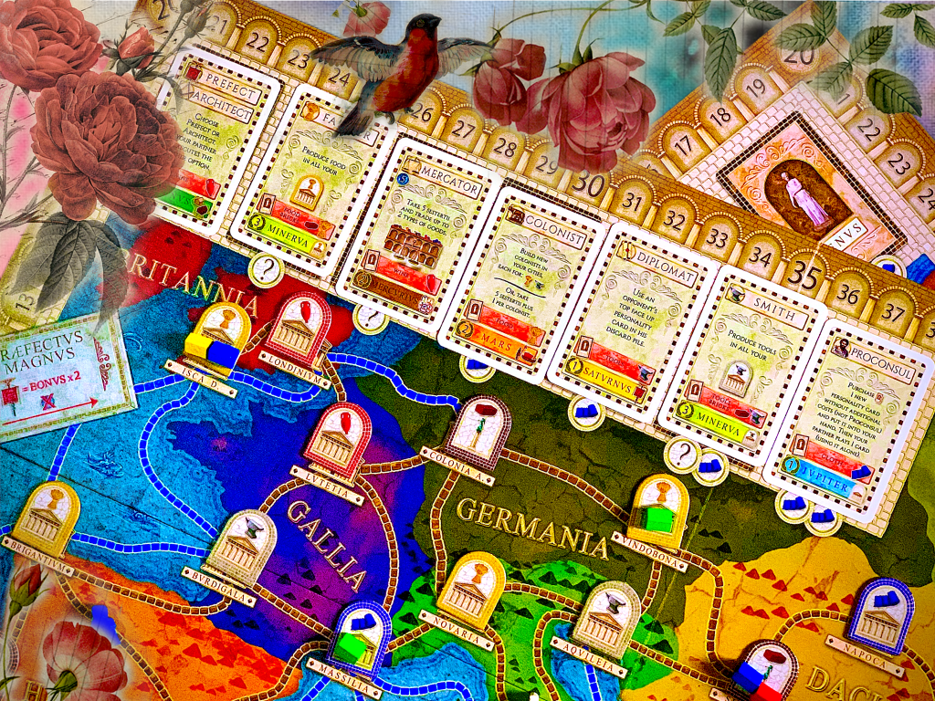 Kitty: And there is not merely one map, but four; lots of luscious cartographical options providing rich settings for your little Roman colonies. The board is essentially an open-air market of strategic possibilities. The market components are cute little tactile nuggets of glee; the cards have a beautiful, almost impressionistic flair. I also love the box art, basic as it may be, probably because I have a crush on Venus!